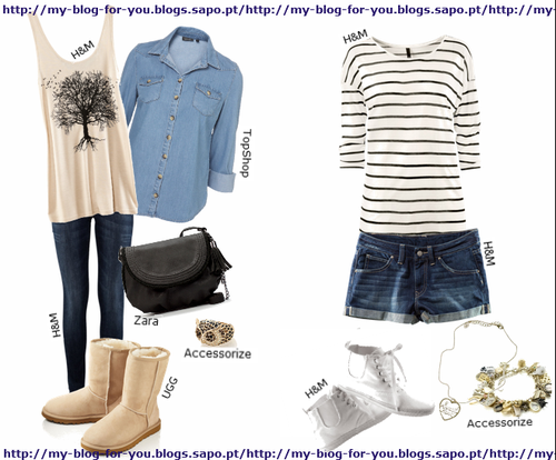 Identifico-me muito com o terceiro look. Gosto imenso da combinação de peças! Temos um top beje com estampado preto, combinado com uma camisa de ganga clara e umas skinny jeans de ganga escura. Para calçar, escolhi umas botas estilo UGG na mesma cor que o top e os acessórios são uma mala preta e um anel. Adequa-se mais ao tempo frio.