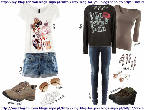 O primeiro look é muito simples, composto por uma t-shirt com estampado, calções de ganga e uns ténis de montanha numa cor que combina com a t-shirt. Os acessórios são poucos, mas completam o look: uns óculos de sol e um relógio. Este look é mais adequado na Primavera (com agasalho) e no Verão.